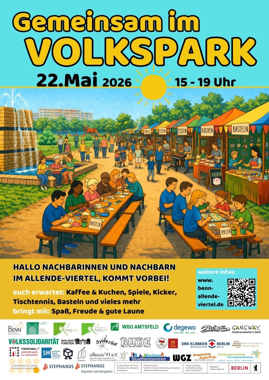 Alle Nachbarinnen und Nachbarn sind herzlich eingeladen, den Volkspark als Ort der Begegnung, des Austauschs und der gemeinsamen Aktivitäten zu erleben.