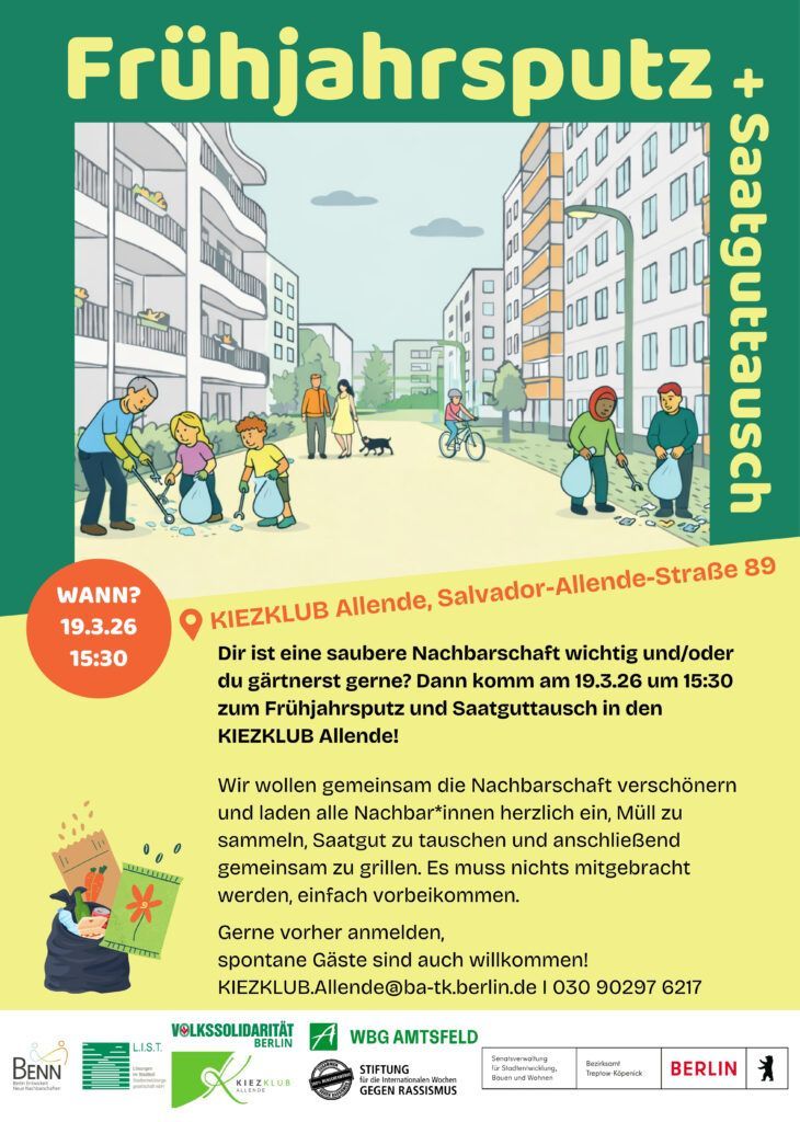 Ihnen liegt ein sauberes Wohnumfeld am Herzen oder Sie gärtnern gerne? Dann seien Sie am Donnerstag, dem 19.3.26, um 15:30 am KIEZKLUB Allende dabei! Gemeinsam sammeln wir Müll, tauschen Saatgut und grillen anschließend zusammen.